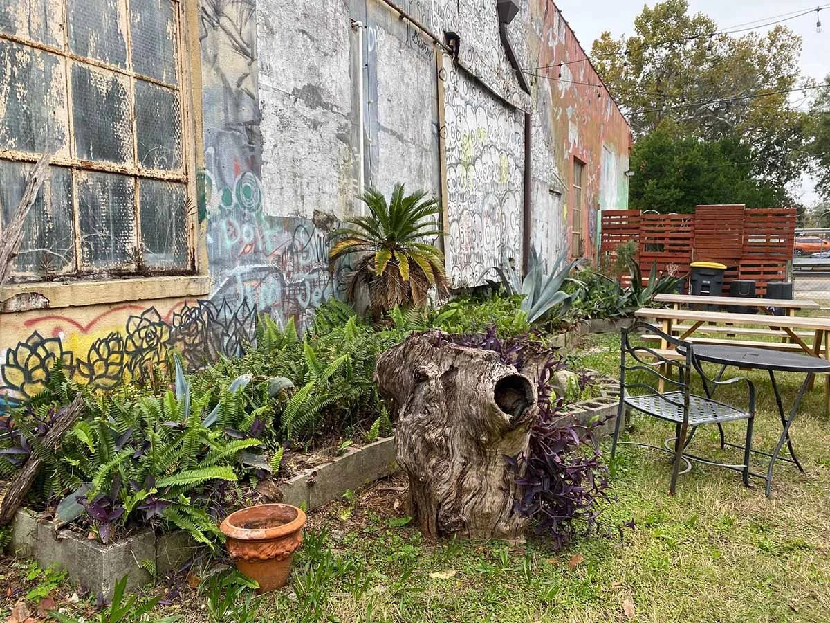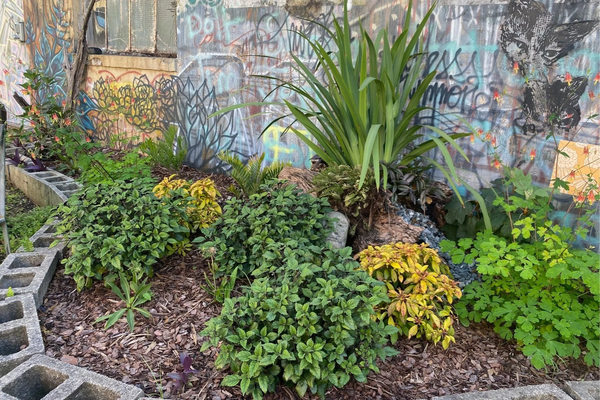 Eight months post-installation, the garden is brimming with new growth. The CoRKyard is a thoroughfare for artists and visitors, running between both buildings. We added Florida-Friendly plantings to the existing beds, bringing life to the area!