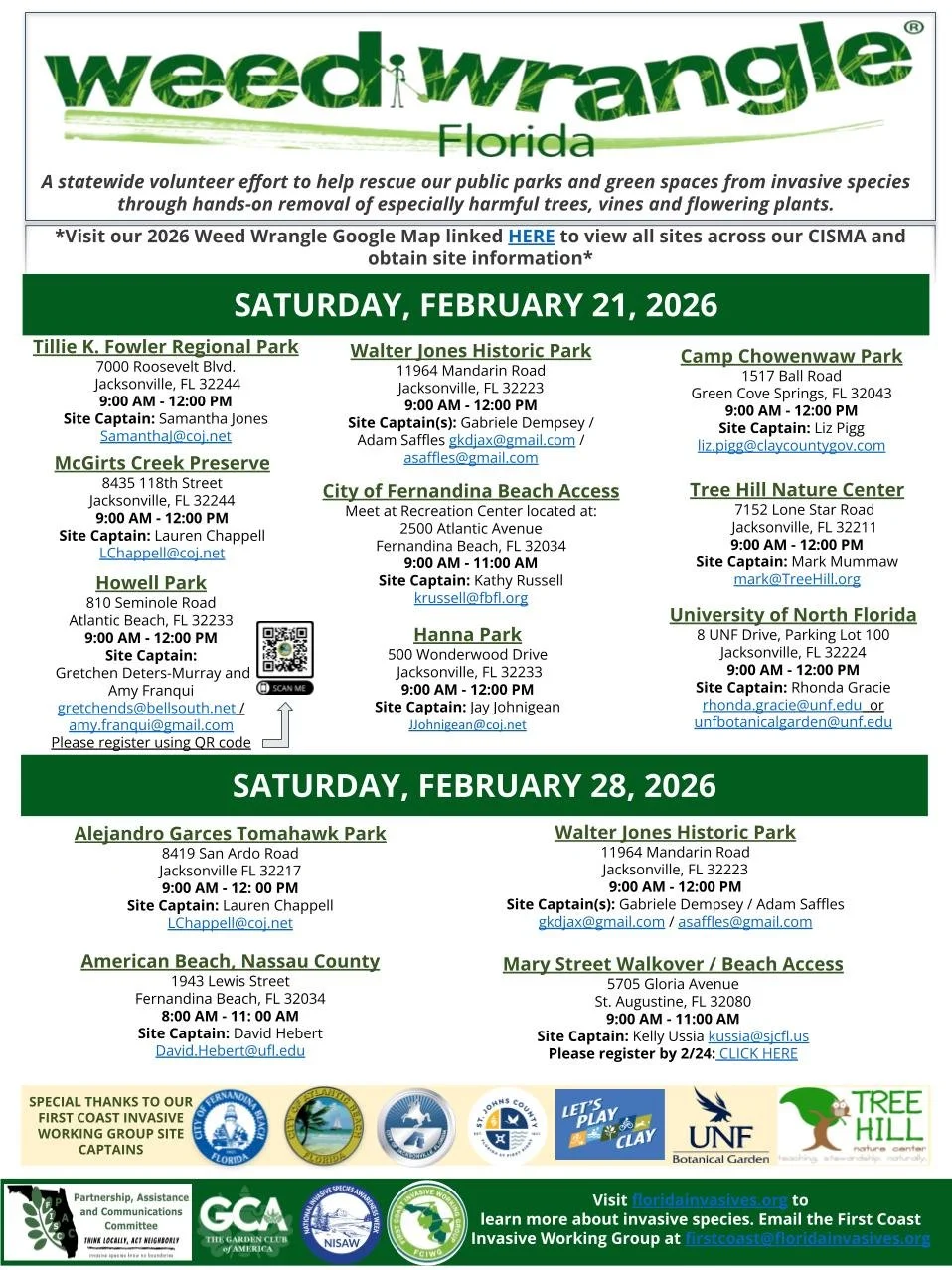 They have been working behind the scenes to organize this year's Weed Wrangle events in support of National Invasive Species Awareness Week in February and spread the word to the public to raise awareness and enlist valuable volunteers to help with invasive removals that week. Some of the invasives targeted across different sites will include coral ardisia, kalanchoe houghtonii / delagoensis, asparagus fern, wedelia, tuberous sword fern and mexican petunia. See the flyer below or click this google map link to find an event near you and email firstcoast@floridainvasives.org for more information!