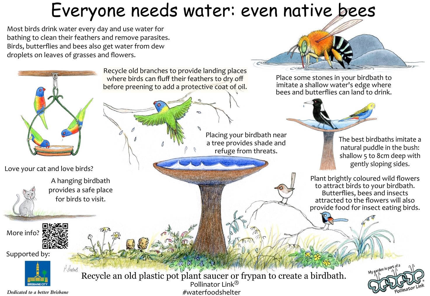 Fresh water provides drinking and bathing opportunities for birds, pollinators, frogs, and other beneficial wildlife.